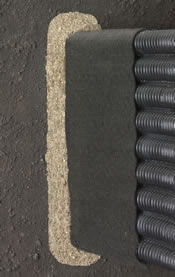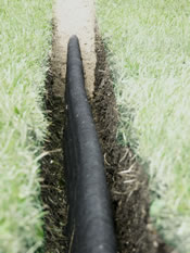 However, where a nearly impermeable clay base is established, laying Multi-Flow directly on the base locates it where the water accumulates and keeps it out of the way of maintenance equipment. This eliminates the need for trenching but protects the integrity of the base. Under playgrounds, sand volleyball courts, and in planters are examples of this condition.